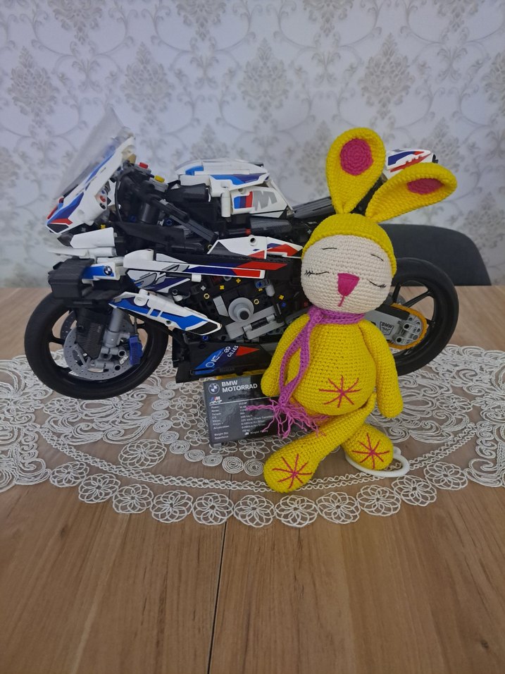 Pembe detaylı, atkılı renkli sarı örgü tavşan bebek, yumuşak dokuludur. içinde müzik kutusu vardır .müzik çalar.