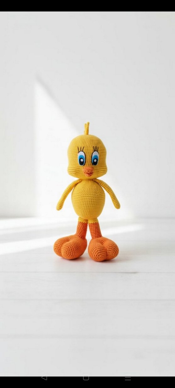 Büyük mavi gözlü, turuncu ayaklı, yumuşak ve sarı renkli örme peluş oyuncak.