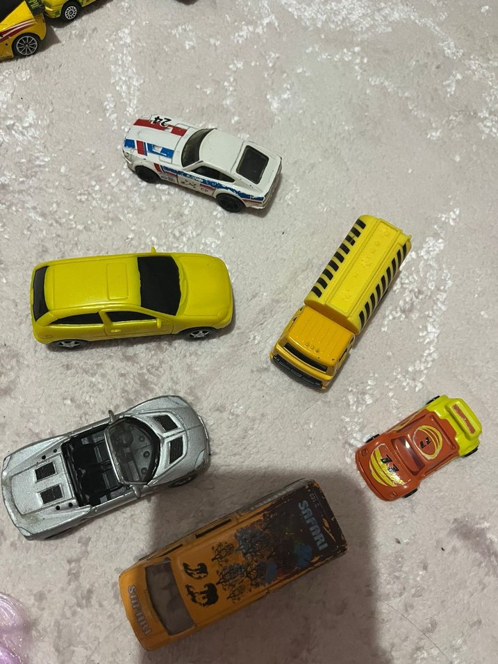 Canlı sarı okul otobüsü ve sarı araba içeren renkli oyuncak araba seti. Hayal gücünü destekler.
