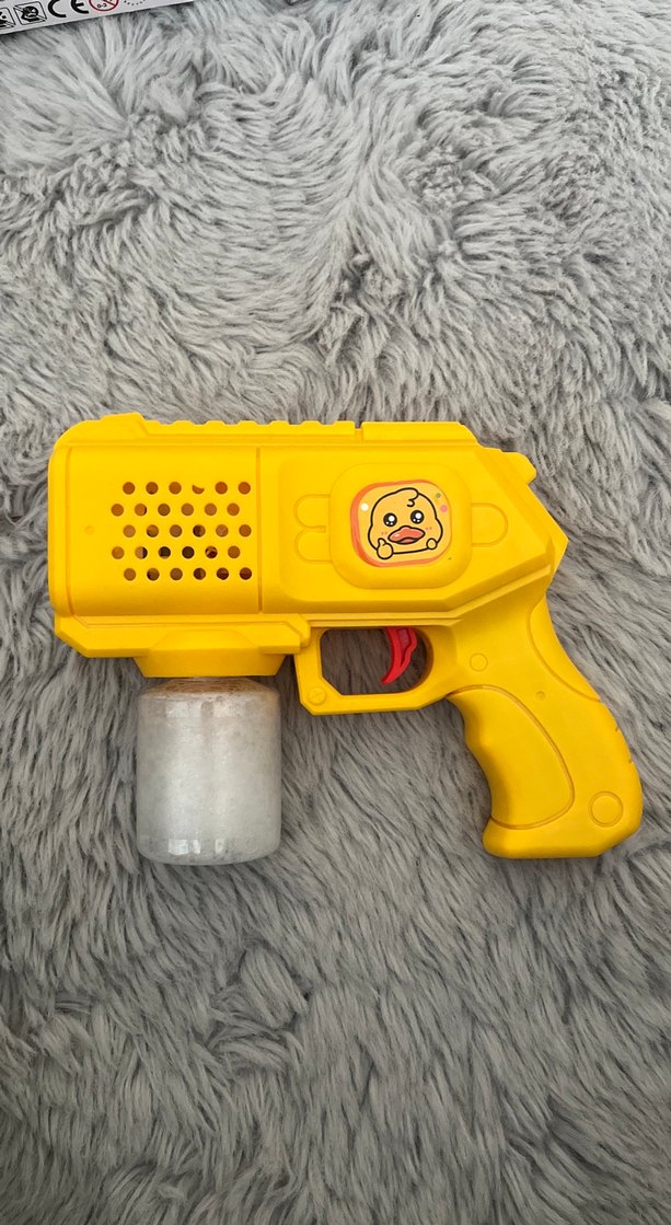 Kompakt tasarımlı, üzerinde oyuncu ördek çıkartması ve köpük kabı bulunan renkli sarı oyuncak tabanca. Baloncuk cıkariyor