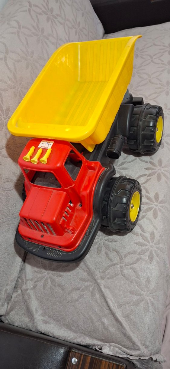 Büyük siyah ve sarı tekerlekli, sarı damperli renkli oyuncak kamyon. Gövdesi kırmızı ve ön kısmında detaylar bulunur.