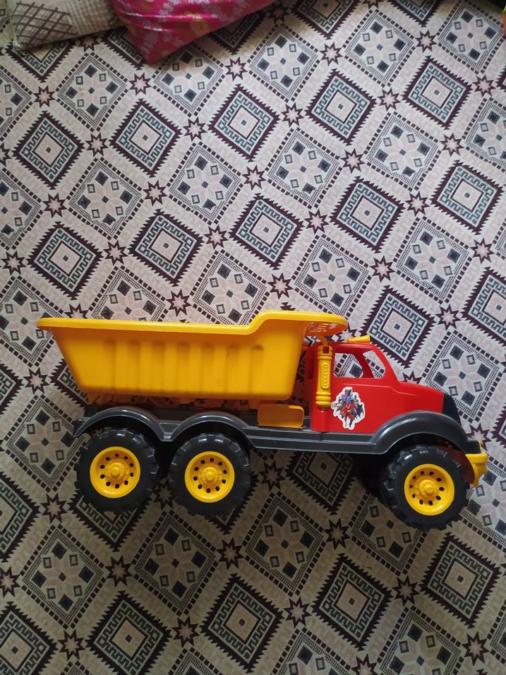 Altı tekerlekli, kırmızı kabinli ve sarı damperli renkli oyuncak kamyon. eni 23 cm yükseklik 27 cm