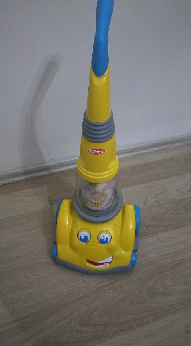 Playskool sesli süpürge. Tüm fonksiyonları çalışıyor. Göz kırpıyor, süpürge sesi çıkarıyor ve konuşuyor. Renkli sarı oyuncak elektrikli süpürge, gülen yüz tasarımı ve şeffaf toz haznesi ile hayal gücünü destekler.