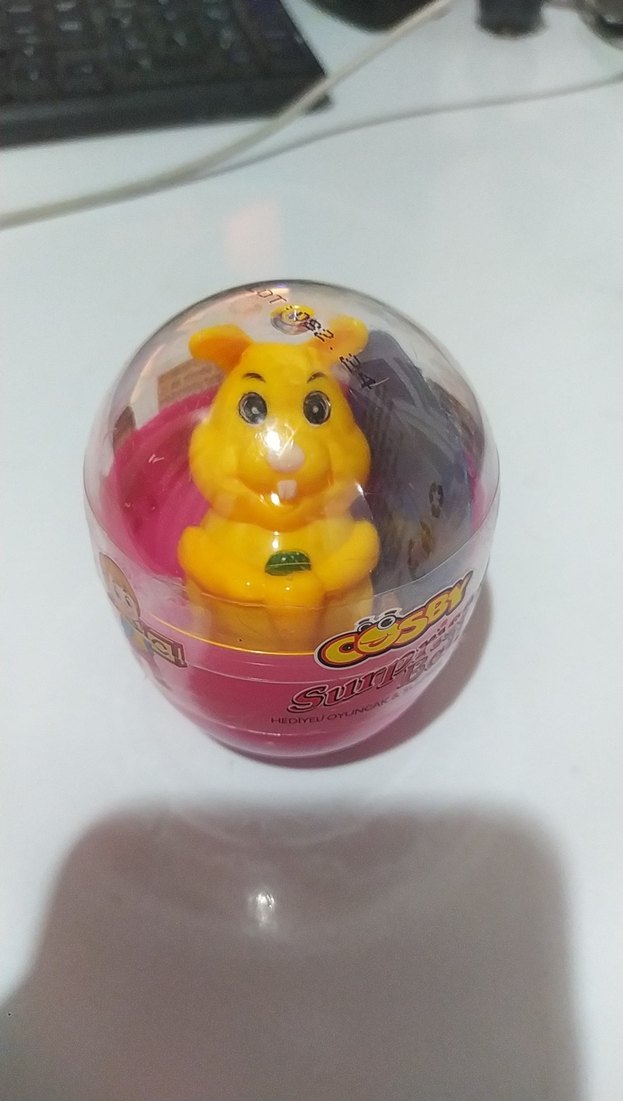 Şeffaf kapsül içinde renkli sarı oyuncak figür, küçük ve eğlenceli bir karakter olarak tasarlanmıştır.