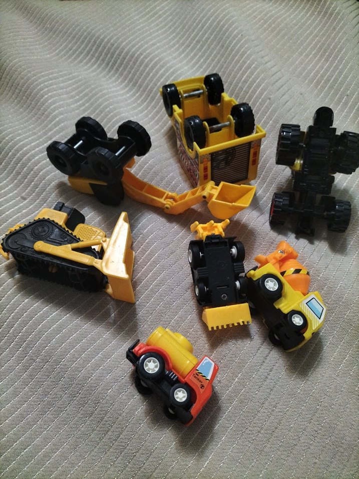 Çeşitli tasarımlara ve hareketli parçalara sahip renkli sarı oyuncak inşaat araçları seti, hayal gücünü destekler. 7 adet arabadan oluşan mini set