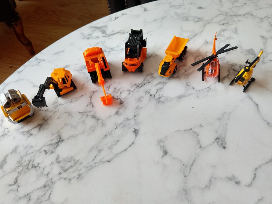 Dayanıklı plastikten yapılmış, ekskavatör, kepçe ve damperli kamyon modelleri içeren renkli sarı oyuncak iş araçları seti.
