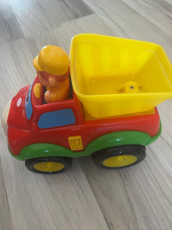 Canlı kırmızı, yeşil ve mavi detaylara sahip, sarı yük bölmeli renkli oyuncak kamyon. İçinde sürücü figürü bulunur. Sesli pilli