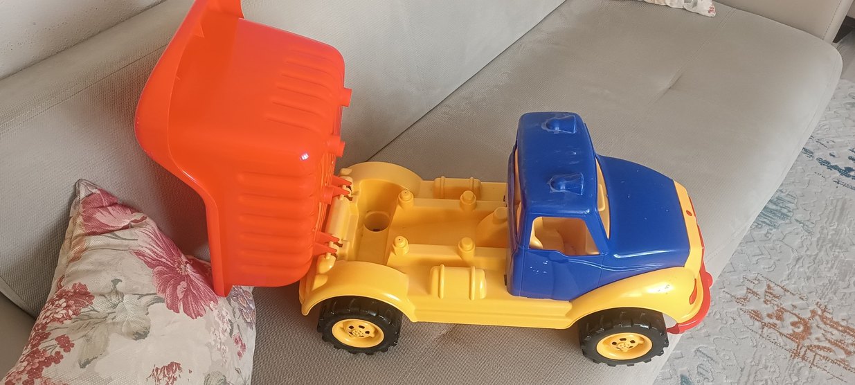 Sarı gövde, mavi kabin ve turuncu yük alanına sahip renkli oyuncak kamyon. Siyah tekerlekleri ve basit tasarımı bulunur.