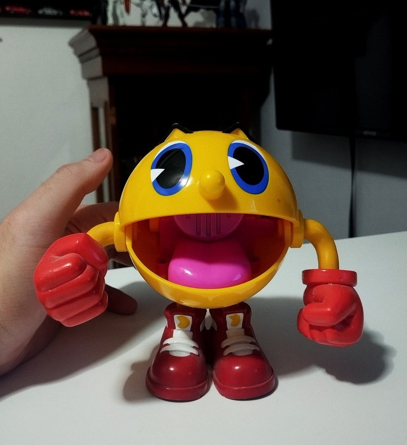 Büyük mavi gözlere, kırmızı eldivenlere ve ayakkabılara sahip renkli sarı Pac-Man aksiyon figürü. ağzı açılıp kapanabiliyor kolları oynuyor ağzını açınca ses çıkartıyor. üzerinde çizikler mevcut yaşına göre iyi durumda