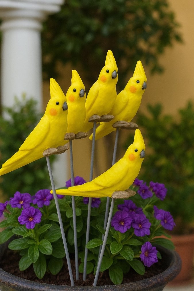Bahçe veya saksı süslemeye uygun, çubuklara monte edilmiş renkli sarı papağan figürleri seti.