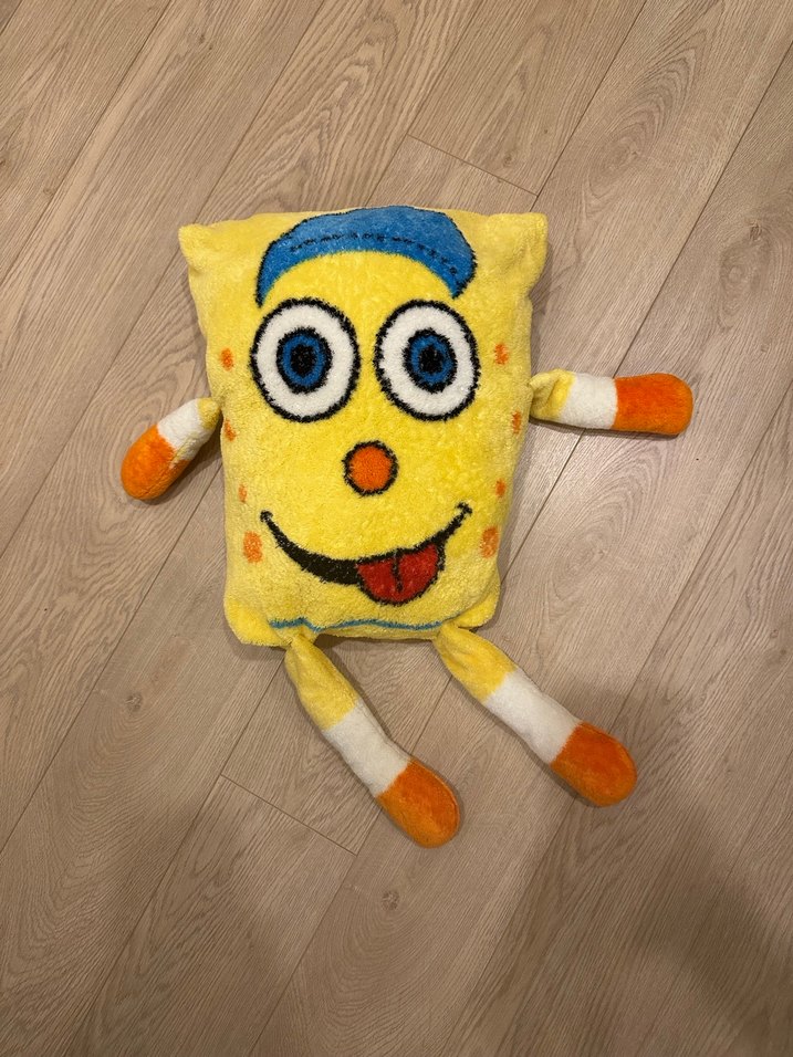 Mavi, turuncu ve beyaz detaylara sahip, yumuşak dokulu renkli sarı peluş oyuncak.