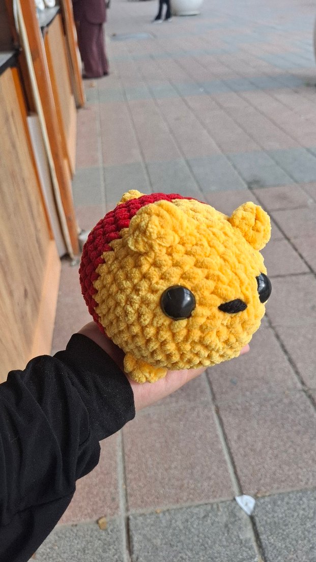 Yumuşak dokulu, sarı ve kırmızı tonlarında renkli peluş ayıcık. Büyük siyah gözleri ve küçük burnu ile sarılmak için uygun.