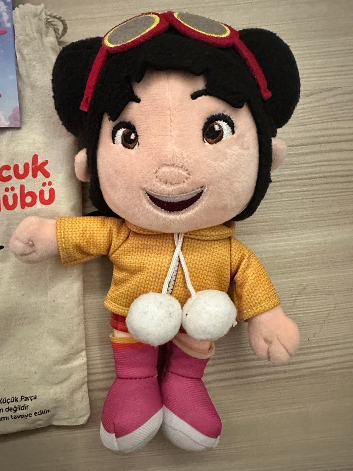 Sarı üst ve pembe ayakkabılı, yumuşak dokulu, gülümseyen yüzlü renkli peluş oyuncak bebek.