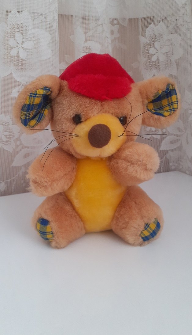 Yumuşak kumaştan yapılmış, kırmızı şapkalı ve kulakları ile ayaklarında ekose detaylar bulunan renkli sarı peluş fare oyuncak.