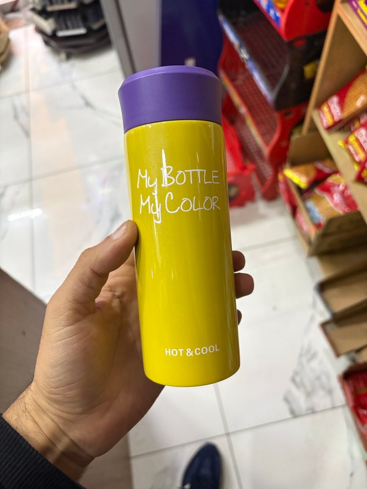 Renkli sarı çocuk termos şişesi, içecekleri sıcak veya soğuk tutar. Mor kapaklı ve üzerinde 'MyBOTTLE MyCOLOR' yazısı bulunur.