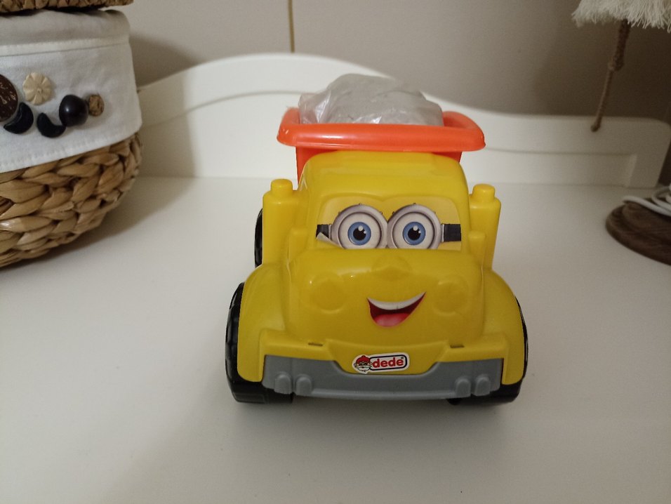 Önünde 'dede' markası bulunan, gülen yüzlü renkli sarı oyuncak kamyon. Eğlenceli ve canlı görünüme sahip. Kinetik kumuyla birlikte verilecektir.