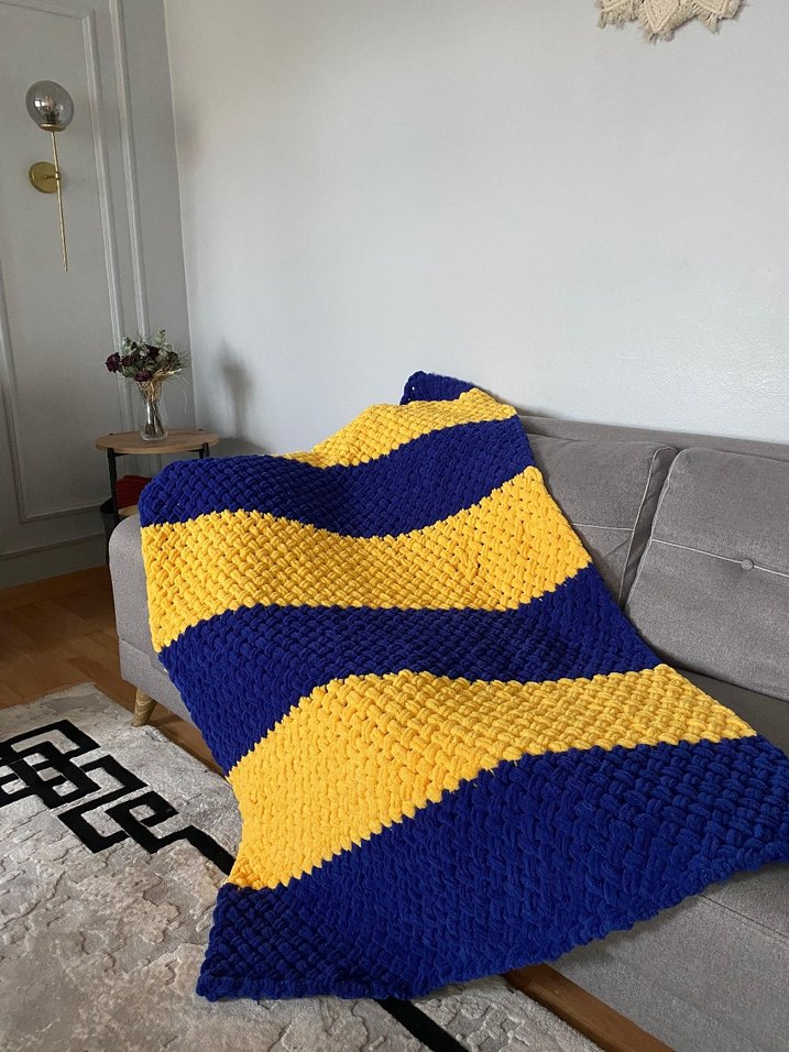 Yumuşak dokulu, sarı ve lacivert geniş renkli şeritlere sahip battaniye, kanepede rahatlamak için ideal. ️