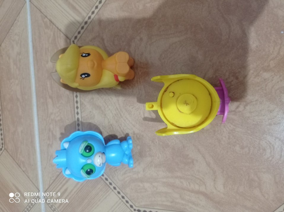 Renkli sarı ve mavi plastik oyuncak figürler, sevimli hayvan tasarımlı. Oyun zamanı için uygundur.