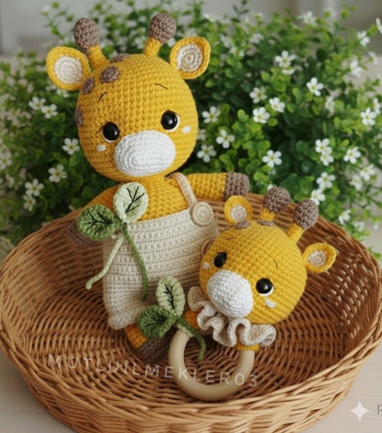 Renkli sarı zürafa şeklinde, yumuşak örgü kumaştan yapılmış el oyuncağı ve çıngırak, kolay tutulabilen ahşap halka içerir.