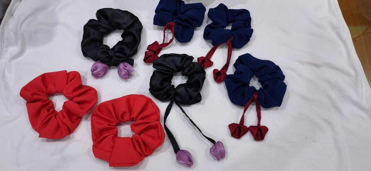 Saten kumaştan yapılmış elastik, çok renkli saç tokaları, uçlarında dekoratif detaylar bulunur. Moda tutkunları için uygun.
