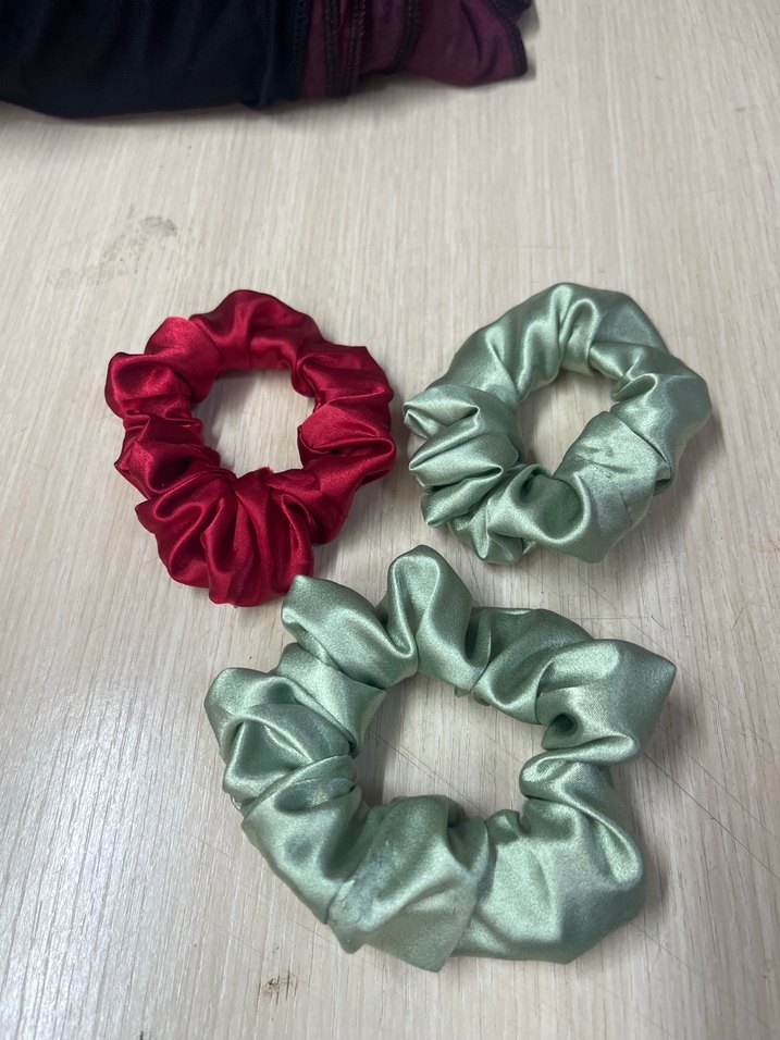 Renkli ve saten dokulu, elastik tokalardan oluşan vintage bohem tarzda saç aksesuarı seti. Canlı kırmızı ve yumuşak yeşil tonlarında. Adetli dikilir