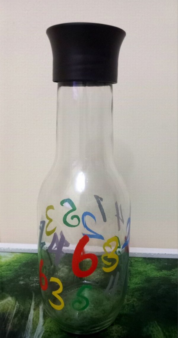 Sayılardan oluşan renkli desenli, siyah kapaklı şeffaf bebek biberonu.