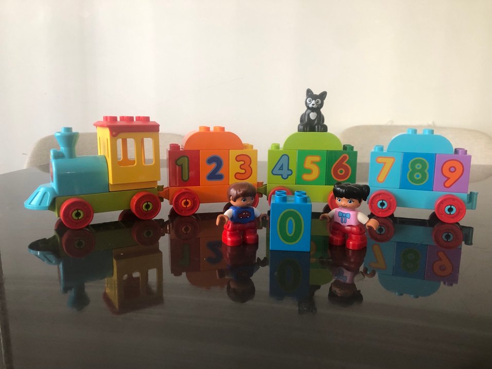0'dan 6'ya kadar sayılar ve iki figürlü, üstünde küçük kedi figürü bulunan renkli LEGO tren seti. Sayılar 4, 5, 6 öne çıkar. Kutusu yok, eksik parçası yok.
