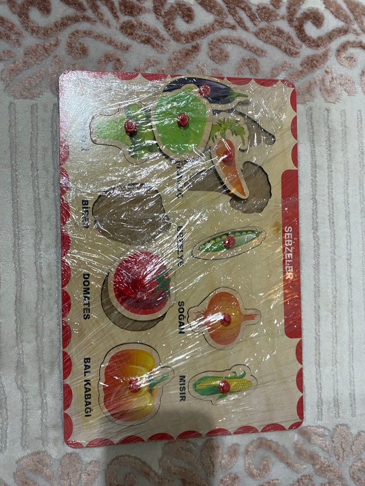 Renkli sebzelerden oluşan, üzerinde domates ve cabagi gibi etiketli parçalar bulunan ahşap eğitici puzzle. Çocukların sebze isimlerini öğrenmesine yardımcı olur.