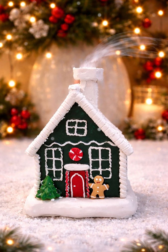 Şeker ev şeklinde renkli figür, küçük ağaç ve zencefilli adam detaylarıyla bacasından buhar çıkarıyor.