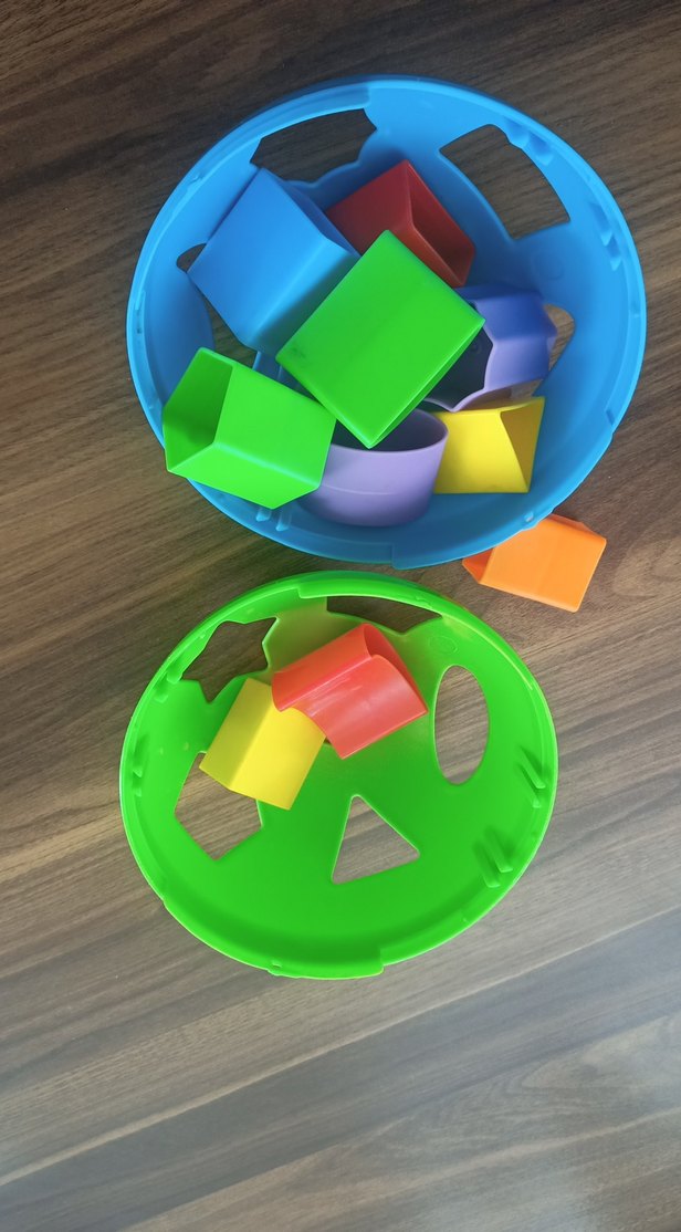 Çeşitli renklerde şekilli bloklar ve şekil eşleştirme kapağı içeren eğitici oyuncak. Motor becerileri ve şekil tanımayı geliştirir.
