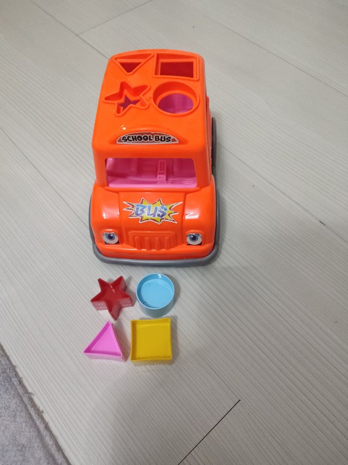 Renkli okul otobüsü şeklinde şekil eşleştirme oyuncağıdır. Yıldız, daire, üçgen ve kare gibi canlı renkte şekiller içerir.