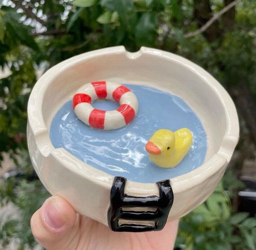 Mavi su efekti, sarı ördek figürü ve kırmızı-beyaz can simidi içeren renkli seramik küllük. Canlı ve eğlenceli tasarım.