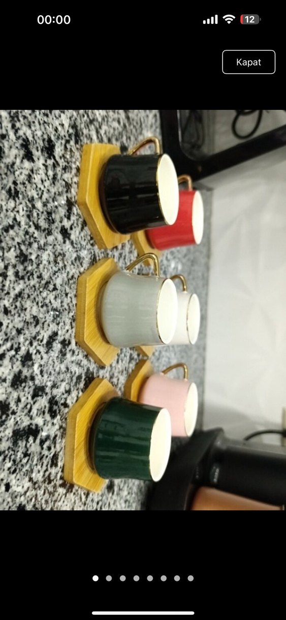 Altıgen ahşap altlıklara sahip, siyah, kırmızı, gri, pembe ve yeşil renklerde seramik fincan seti. Altın sap detaylıdır. ☕ Az kullanıldı fiyatta yardımcı olurum ‼️‼️