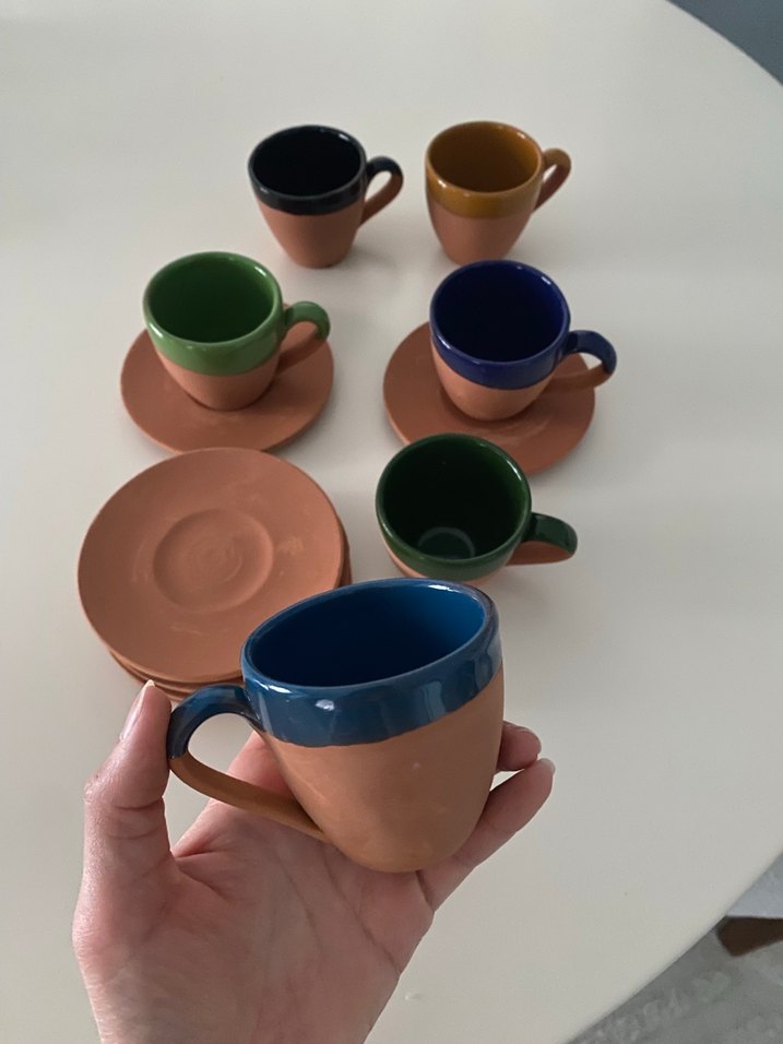 Farklı koyu renklerde seramik fincan ve tabağı seti, kahve sunumu için uygundur. ☕