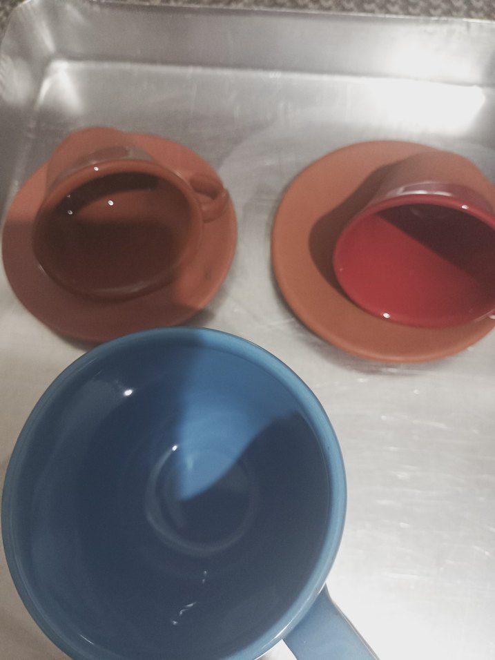 Koyu ve canlı renklerde, mavi, kahverengi ve kırmızı seramik fincan ve tabak seti. Sıcak içecekler için uygundur. ☕