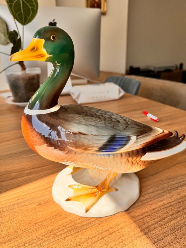 Koyu gri, yeşil ve turuncu renklerde detaylı seramik ördek figürü, beyaz Goebel marka taban üzerinde duruyor. Kusursuz life size bire bir ördek ölçüsüdür