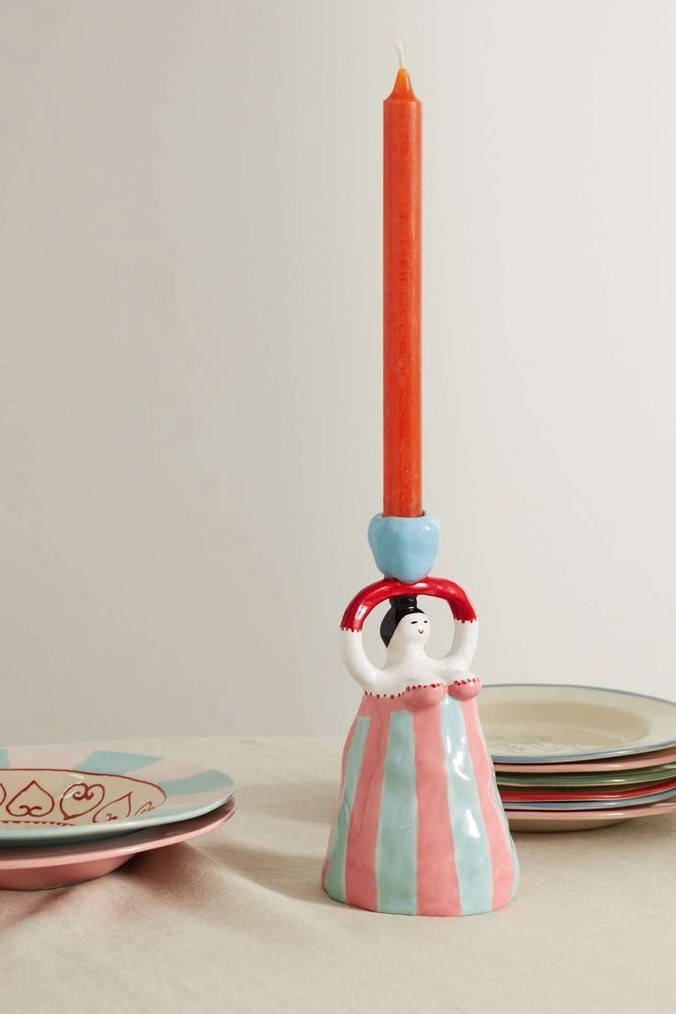 Pastel renklerde, kadın figürlü seramik mumluk. İnce mumlar için uygun ve dekoratif bir tasarıma sahip. ️