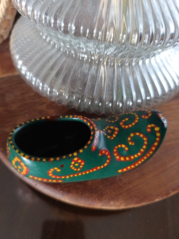 Renkli seramikten yapılmış, yılan desenli kadın terliği. Bohem ve retro tarzını yansıtır, vintage eskilerden