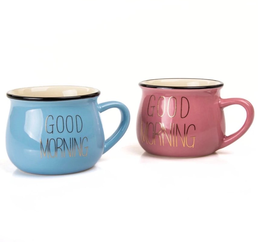 Pembe renkte, 'Good Morning' yazılı renkli seramik kupa. Sabah içecekleriniz için uygun. ☕