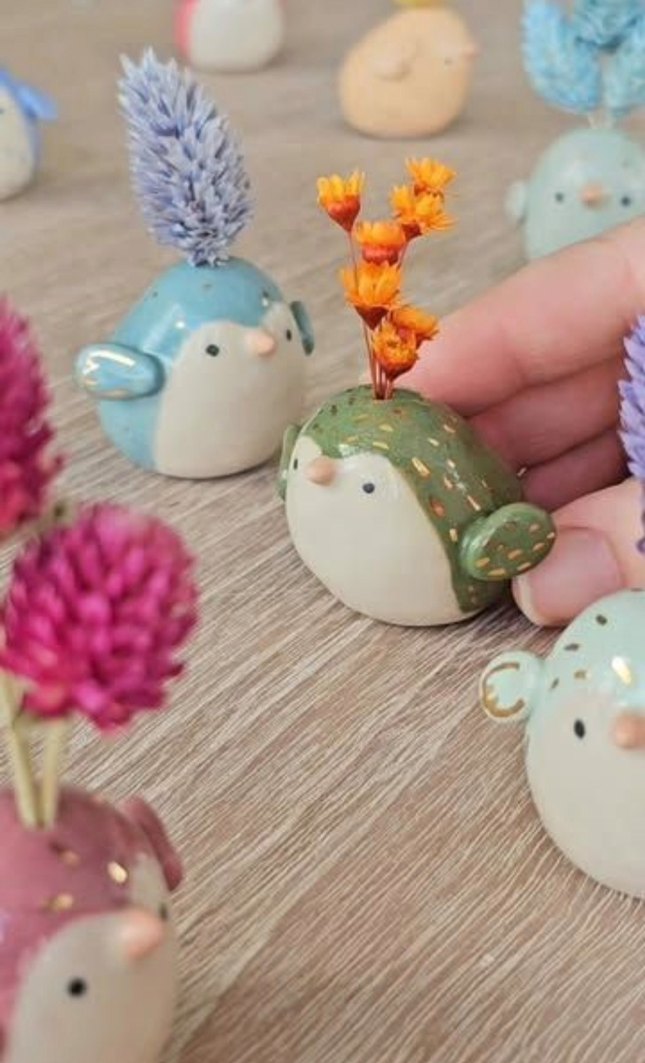 Renkli seramik kuş figürlü vazolar, üstünde küçük kurutulmuş çiçeklerle birlikte. Pastel tonlarda ve yuvarlak tasarımlı, dekoratif amaçlı kullanılabilir.