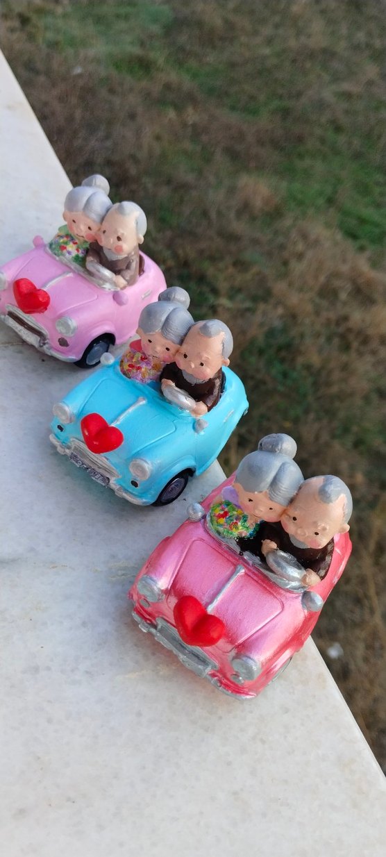Pembe ve mavi küçük arabaların içinde oturan yaşlı çift figürleri, arabaların önünde kırmızı kalp süslemeleri bulunur. Adet fiyatıdır. istenilen renkte sipariş alınır. İstenilen renkte sipariş alınır.