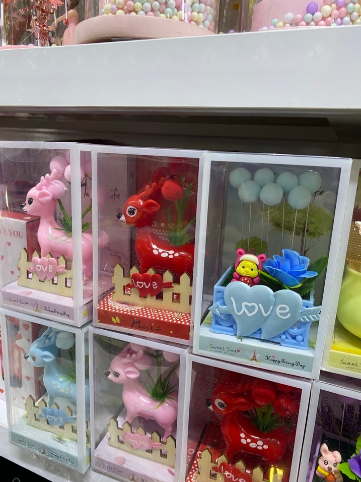 Sevimli hayvan figürleri ve 'love' yazılı kalp detaylarıyla renkli dekoratif oyuncaklar. Hediyelik veya dekor için uygun.