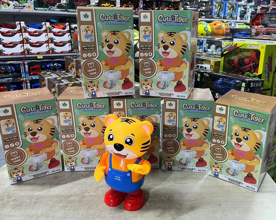 Sevimli sarı kaplan oyuncak, Cute Tiger, şarkı söyleyip dans eder. Mavi tulumlu ve kırmızı ayakkabılıdır.
