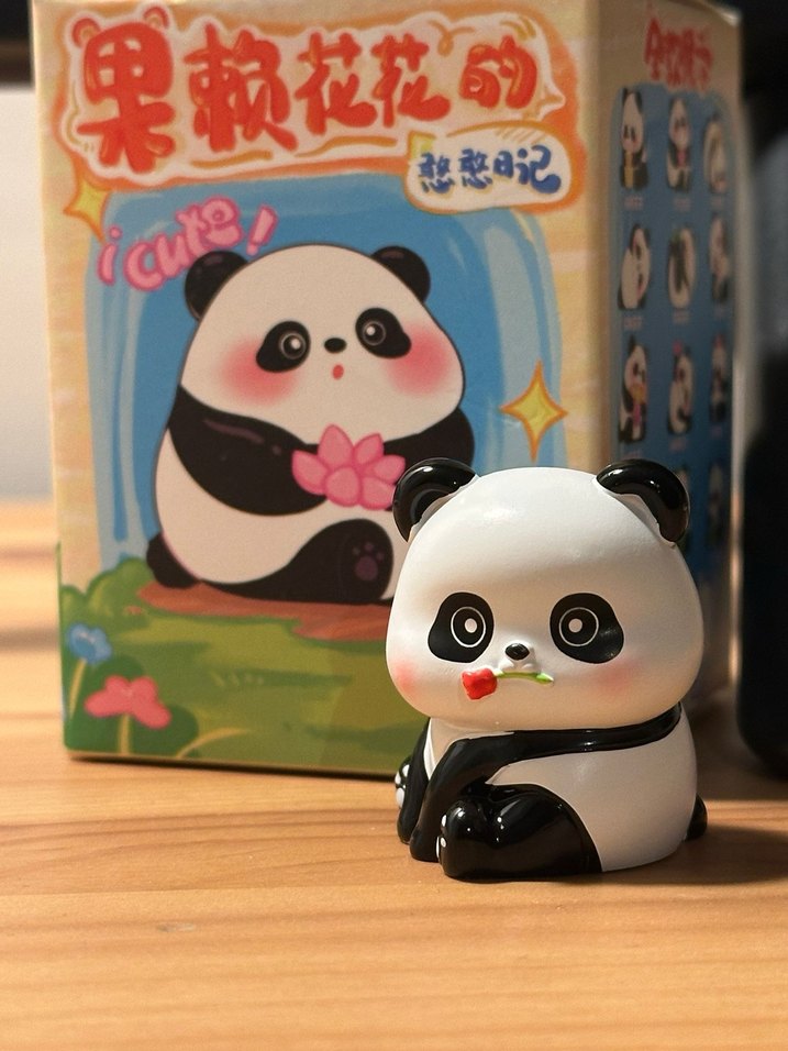 Beyaz ve siyah renkte, küçük bir çiçek tutan renkli sevimli panda aksiyon figürü.