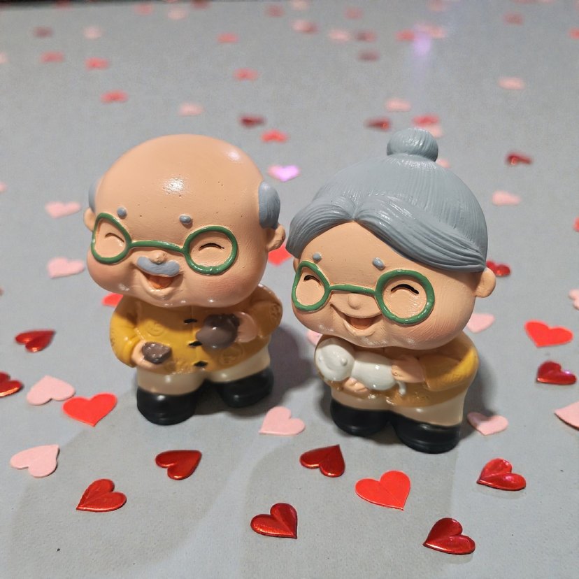 1 çift gönderilir Renkli ve neşeli ifadeli yaşlı çift figürleri, gözlüklü ve bej tonlarında detaylara sahip. ❤️