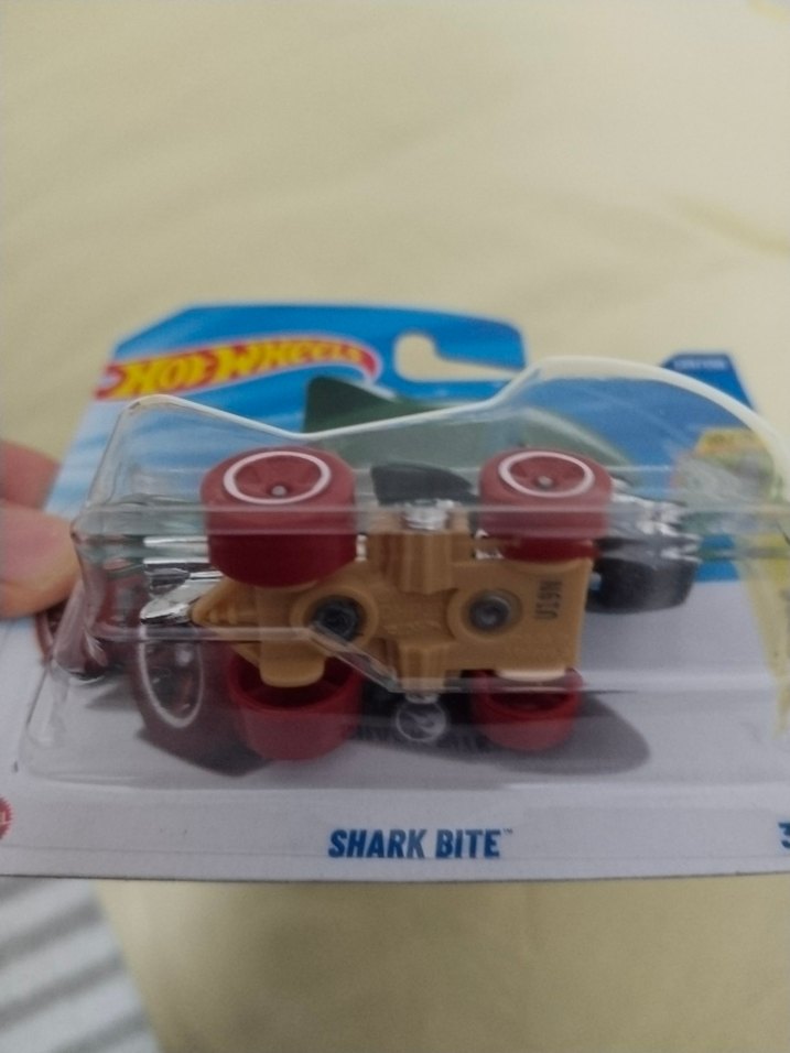 Kahverengi gövdesi ve kırmızı tekerlekleri olan Shark Bite adlı renkli oyuncak araba. Üzerinde 'SHARK BITE' yazısı bulunur.