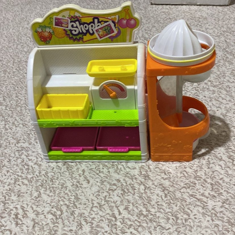 Renkli Shopkins oyuncak market seti, oyun terazisi, sepetler ve meyve sıkacağı içerir.