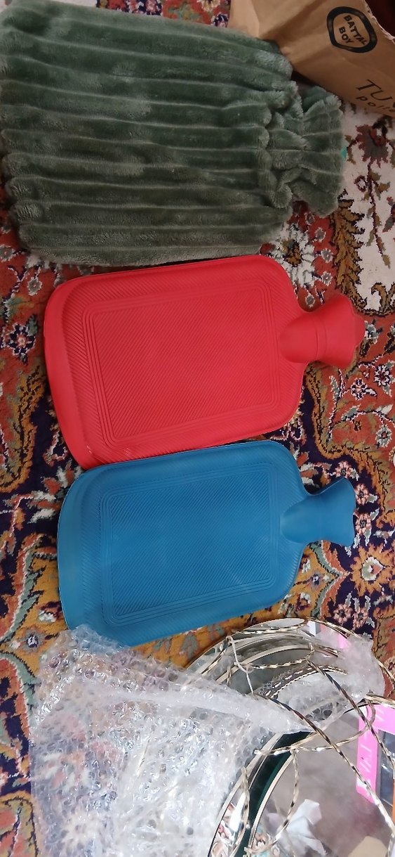 Kırmızı ve mavi renklerde sıcak su torbaları, yumuşak dokulu yüzeyle kolay kavrama sağlar. Çocuklar ve yetişkinler için kullanışlıdır.