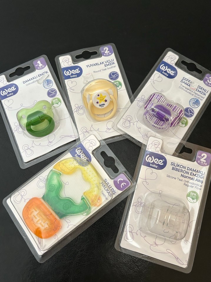 Farklı yaşlara uygun, çeşitli şekil ve boyutlarda renkli silikon emzikler. Her paket bir adet emzik içerir. Diş kaşıyıcısı