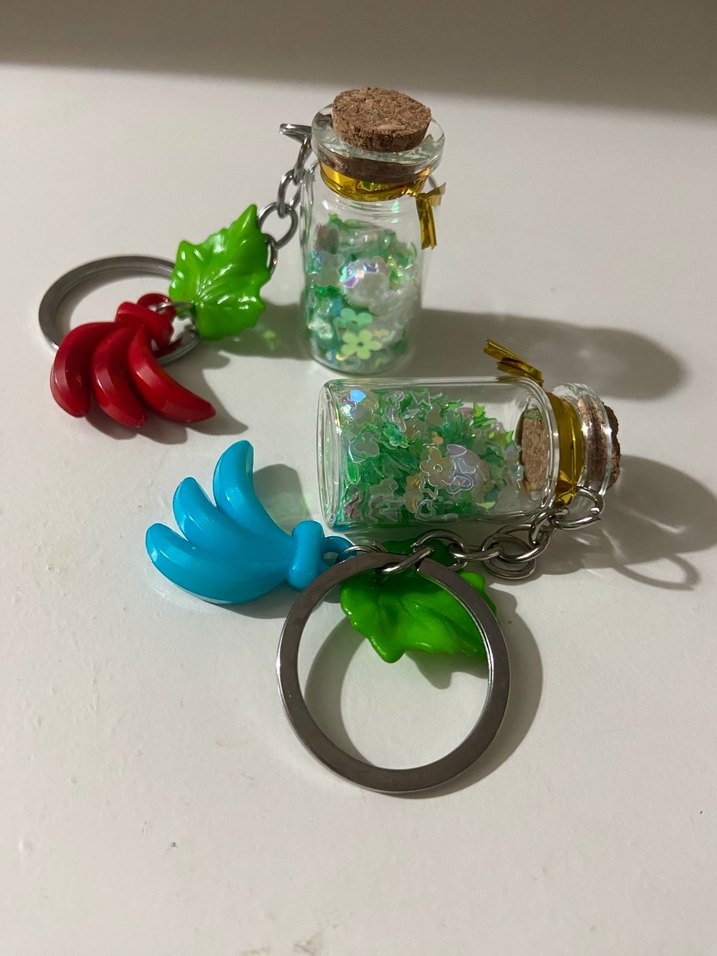 Renkli cam şişelerde sim ve inci boncuklar bulunan, pembe ve sarı figürlerle süslenmiş metal halka anahtarlık seti. ✨ ikili fiyattır